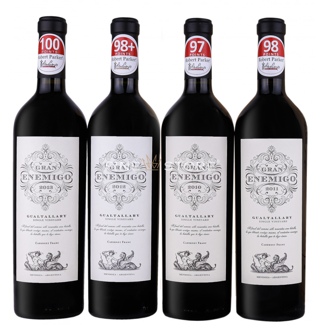 Un vin argentinian single vineyard de excepţie, Bodega Aleanna Gran Enemigo Gualtallary este ceea ce colecţionarii aseamănă adesea cu legendarele vinuri roşii de Bordeaux. An după an, vinul dezvăluie o degustare impecabilă, concentrată pe arome de fructe negre şi atingeri de cretă, etalându-şi pe deplin nuanţele atunci când este savurat la temperatura optimă de 14-16 grade Celsius. Strugurii Cabernet Franc aleşi să dea tonul vinului alături de un mic procent Malbec sunt copţi la perfecţiune la altitudine mare, unde lumina soarelui îi mângâie direct, iar solul asigură baza pietroasă şi calcaroasă de care aceştia au nevoie pentru a contura un vin roşu complex, de o expresivitate aparte. Bodega Aleanna Gran Enemigo Gualtallary îşi păstrează naturaleţea gustului şi după maturarea de 7 luni în butoaie mari de stejar franțuzesc la a doua și a treia umplere şi aduce în gust savoarea imaculată ce caracterizează viile din sudul Mendozei, aşa cum a variat ea în toţi cei patru ani de recoltă înscrişi pe etichetele sticlelor din acest set.