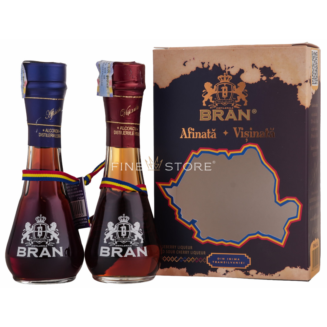 Setul cu două ţoiuri de Vișinată și Afinată Bran reuneşte două licori excepționale, cu arome speciale. Pentru Bran Vișinată s-au folosit fructe crescute în regiunea de nord a Transilvaniei, la poalele munților. După culegere, vișinele au fost macerate la răcoare, pentru ca inconfundabila aromă dulce-acrișoară să se regăsească din plin în rezultatul final. Şi în cazul Afinatei Bran fructele provin tot din zona de nord a Transilvaniei, iar procesul lor de macerare desăvârșește o licoare fabuloasă în miros, gust și culoare. Atât Vișinata cât și Afinata se savurează ca aperitiv şi deschid apetitul pentru voie bună și experiențe culinare speciale.