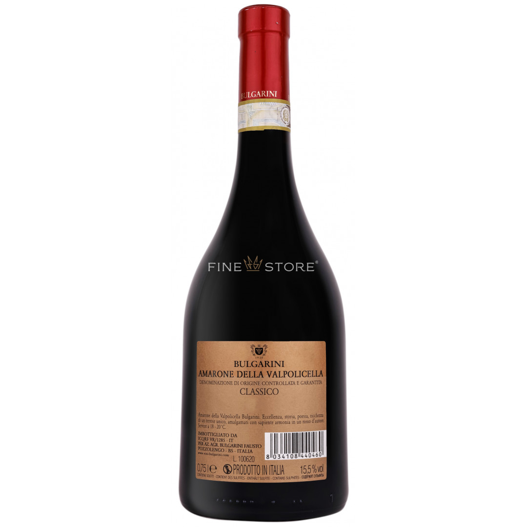 Bulgarini Amarone della Valpolicella Classico este un vin roșu sec, originar din regiunea San Pietro in Cariano – Verona. Cupajul reuneşte trei soiuri de struguri - Corvina Veronese în proporție de 50%, Corvinone în proporție de 30% și Rondinella în proporție de 20%. Strugurii sunt culeși manual în septembrie și păstrați cu tot cu ciorchine la o temperatură controlată, ca apoi să se realizeze procesul de macerare și cel de fermentaţie în cisterne de oțel inoxidabil. În aceste cisterne, licoarea este păstrată timp de 12 luni, urmând să treacă printr-un al doilea proces de maturare în butoaie de stejar, timp de 40 de luni. Acest proces complex este finalizat cu 8 luni de maturare în sticlă, iar rezultatul este un buchet gurmand de prune și gem de cireșe, cu tonuri delicioase de vanilie și atingeri vibrante de condimente. Gustul nu se lasă mai prejos şi descrie note extrem de bine armonizate, încheind întreaga experiență a degustării cu un postgust prelung, fabulos.