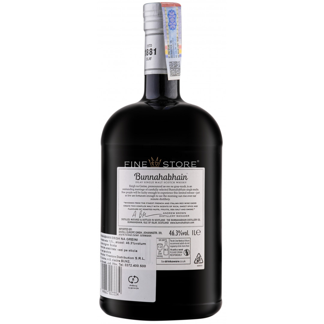 Pronunţat Ae-ree ne gray-nyuh şi tradus ‘cerul dimineţii’, Bunnahabhain Eirigh Na Greine promite să aducă strălucirea începutului de zi în degustare prin arome ample de fructe, malţ şi condimente dulci. Localizată pe coasta nord-estică a insulei Islay, distileria Bunnahabhain foloseşte apă din râul Margadale pentru licorile sale, iar faptul că acest râu nu întâlneşte în cursul său zone de teren cu turbă face ca whisky-ul Bunnahabhain să aibă cea mai subtilă aromă de fum dintre toate sortimentele create pe teritoriul Islay, de cele mai multe ori insesizabilă. Stilul distileriei este în schimb acela de whisky un pic uleios, cu note sărate, plăcut şi uşor de băut, iar de această dată, gustului clasic i se adaugă arome fructate, extrase în urma maturării exclusive în butoaie de vin roşu franţuzesc.