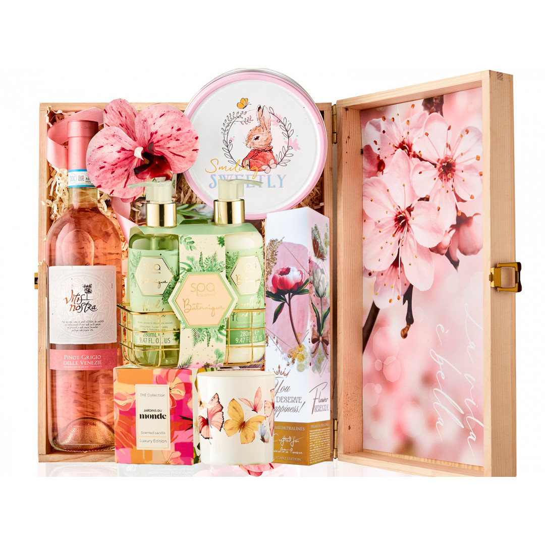 Îmbrățișează spiritul vibrant al primăverii și celebrează feminitatea cu acest cadou inedit, pregătit să aducă un zâmbet luminos pe chipul oricărei femei! Vitis Nostra Pinot Grigio Delle Venezie Rosato DOC dezvăluie în aromatica sa îmbinarea perfectă dintre prospețimea primăverii și rafinamentul gustului, aducând o notă de eleganță cu fiecare picătură, pralinele îmbie cu arome delicate și texturi fine, garantând o experiență de neuitat, iar lumânarea parfumată îmbracă atmosfera în arome proaspete și florale, creând o atmosferă plină de căldură și confort. Fursecurile daneze completează perfect momentele de relaxare și răsfăț, iar crema de față Organic Peony și masca Vital Infusion Deep Clean aduc o îngrijire specială și revitalizantă pentru piele, subliniind frumusețea naturală într-un mod absolut fermecător și memorabil!