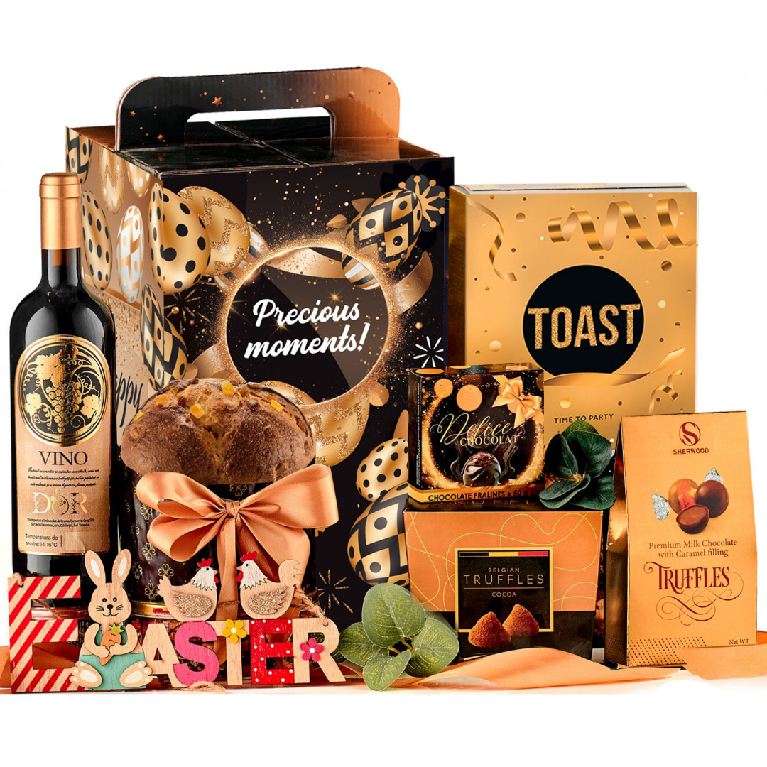 În această cutie elegantă și plină de farmec, vei descoperi cele mai savuroase arome ale Paștelui! Cadoul Arome de Paște îmbină tradiția cu rafinamentul astfel încât să captiveze din primul moment și oferă o gamă variată de gusturi și texturi pentru a sărbători Paștele într-un mod cu totul special. Vinul roșu aduce arome intense și o notă distinctivă în pahar, deliciosul panettone cu stafide și coajă de portocală îmbie cu gustul său inconfundabil și cu textura aerată, trufele belgiene par că se topesc atunci când sunt degustate, iar bomboanele cu accente de caramel și vanilie încântă simțurile cu dulceața lor subtilă. Descoperă mai jos tot ce conține Cadoul Arome de Paște și oferă-l persoanei care are nevoie de un pic de magie de sărbători!