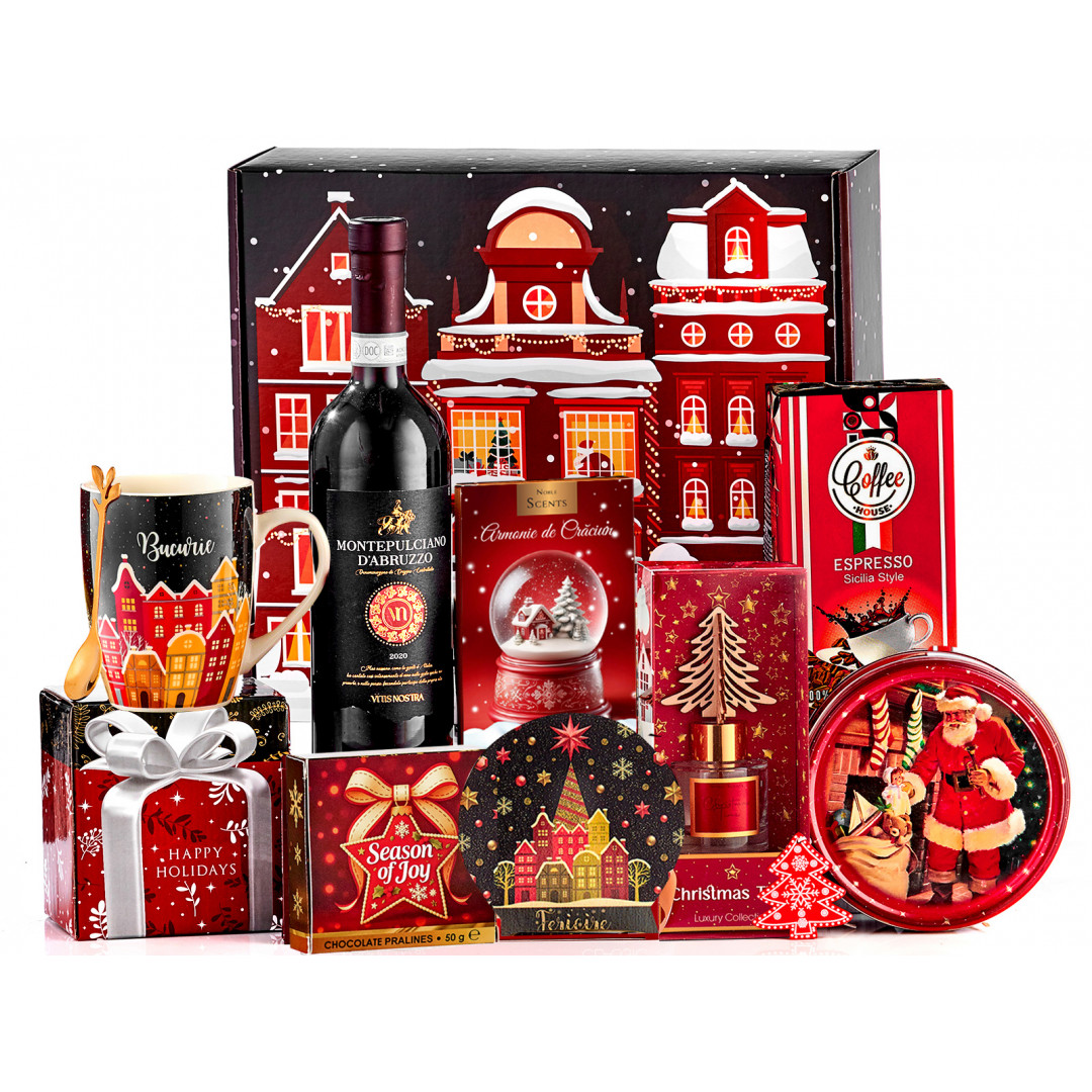 Ce poate fi mai plăcut într-o dimineață rece de iarnă decât să te trezești cu un mic dejun la pat și-n casă să fie cald, să te bucuri de gustul unei cafele italiene și de fursecuri daneze sau de un ceai fierbinte sorbit dintr-o cană festivă? Poate o seară liniștită la foc de șemineu, cu vin roșu în pahar și bomboane de ciocolată delicioase la îndemână. Oricum ar fi, Cadoul Căsuța cu Surprize îți aduce în dar toate aceste ispite gurmande, dar și ceva în plus: o lumânare splendid parfumată cu arome de iarnă și o decorațiune de Crăciun care vestește un an și mai bun!