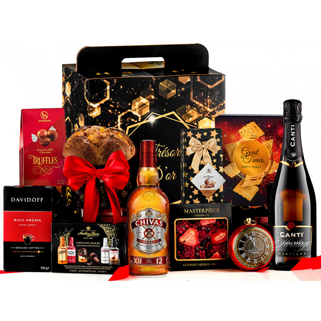 Cadoul Chivas Elite este o alegere exclusivistă pentru cei care apreciază rafinamentul și luxul și promite să le ofere o experiență de neuitat tuturor celor care îl primesc. Chivas Regal 12 Ani îmbină savoarea unică a malțului cu note subtile de miere și fructe uscate pentru a garanta o degustare cu totul specială, iar bomboanele și ciocolata artizanală cu bucățele de căpșune, coacăze și zmeură răsfăță simțurile cu dulceața lor delicioasă. Lumânarea parfumată din colecția Noble Scents Luxury și ceaiul premium Basilur Anniversary completează perfect această experiență opulentă, iar cafeaua Davidoff Rich Aroma îmbogățește paleta gustativă cu extra rafinament.
