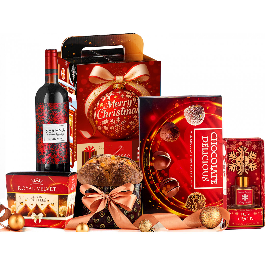 Pentru cei care adoră surprizele, Cadou Gusturi de Crăciun e alegerea perfectă! Gusturile fine for fi răsplătite cu un vin roșu delicios, pofta de dulce va fi potolită cu praline și panettone pufos, iar relaxarea va deveni realitate cu ajutorul difuzorului parfumat, care îmbracă orice încăpere în atmosferă de sărbătoare. Cu siguranță Cadoul Gusturi de Crăciun va aduce un zâmbet pe chipul persoanei care-l va primi în dar, iar zilele de sărbătoare le va asocia cu gestul tău făcut din inimă!