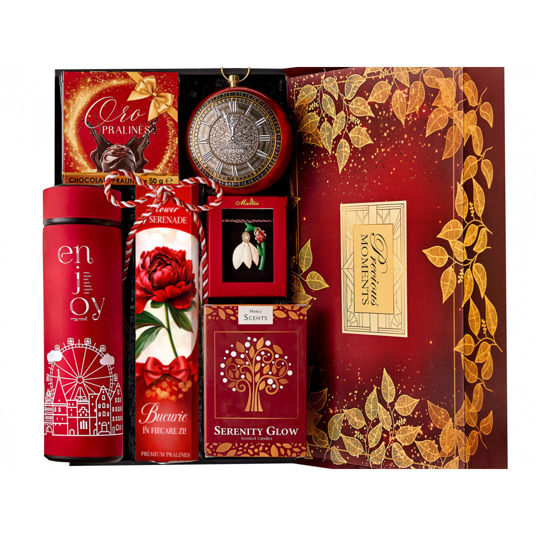 Dacă ai senzația că primăvara durează mereu prea puțin, e pentru că trăiești fiecare moment din plin! Iar pentru a-ți garanta o primăvară plină cu momente de neuitat, am pregătit un cadou plin de farmec și produse care mai de care mai interesante. Vei regăsi în interior praline deosebit de fine, un ceai ambalat în cutie aniversară și bomboane delicioase, dar și accesorii care se evidențiază prin design și prin arome! Nu putea lipsi nici șnurul de mărțișor dintr-un cadou ce marchează momentele speciale și împarte voie bună la fiecare persoană care-l primește.