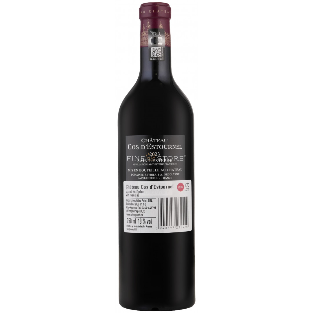Vinul ce dăruieşte 300% din potenţialul strugurilor culeşi din podgoriile domeniului Chateau Cos D'Estournel, primeşte pe bună dreptate nota perfectă din partea degustătorilor de top ai lumii şi adună 100 Puncte Parker, 100 Puncte Suckling şi 100 Puncte Vinous. Dominique Arangoïts construieşte acest vin emblematic pe baza strugurilor Cabernet Sauvignon, cărora le adaugă un mic procent de struguri Merlot şi unul foarte mic de Cabernet Franc, atât cât să se creeze magia. Vinul e maturat 15 luni în butoaie de stejar franțuzesc, dintre care 65% noi și 35% la a doua folosire, astfel că dezvoltă un caracter eclectic, încărcat de energie şi profunzime. “Vinul monumental, care va produce nu ani, ci zeci de ani de plăcere”, după cum spune Antonio Galloni, poate fi acompaniat în degustare de fripturi de miel sau raţă afumată, iar o temperatură recomandată de servire cuprinsă între 16-18 grade Celsius va crea ocazia perfectă pentru ca Chateau Cos D'Estournel Saint – Estephe să-şi exprime pe deplin graţia, armonia şi nu în ultimul rând perfecţiunea în pahar!