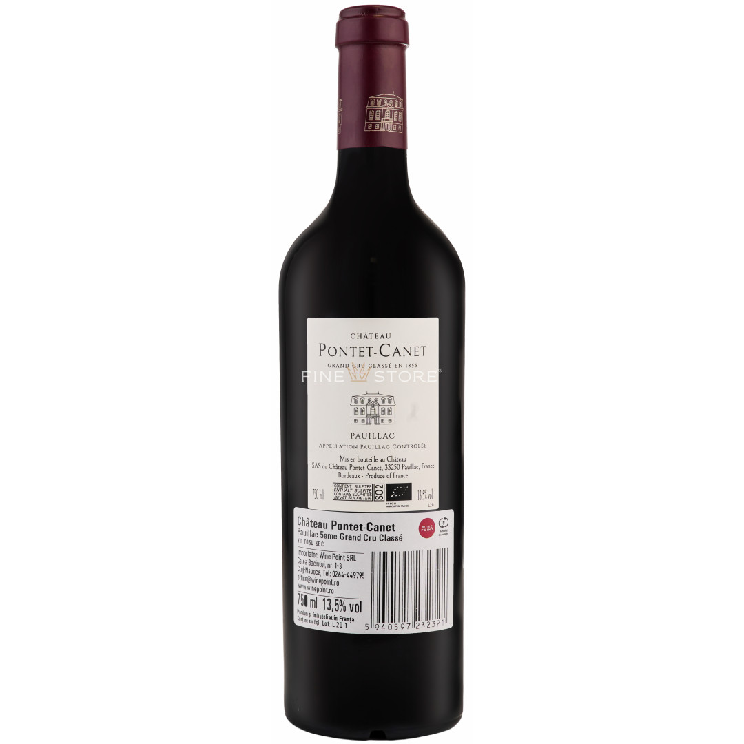 Château Pontet-Canet este o proprietate legendară. Aici, crearea fiecărui vin este o artă, iar degustarea o încantaţie a momentului prezent, menită să lase în urmă şi spaţiul şi timpul. Chateau Pontet - Canet Pauillac Grand Cru Classe se numără printre cele mai bune vinuri din anul său, în faţa sa dându-şi jos pălăria degustători de top ai lumii. Stilul său concentrat dezvăluie intensitate şi forţă, iar gustul exprima prin toţi porii fruct negru şi o mineralitate splendidă. Strugurii Cabernet Sauvignon, Merlot, Cabernet Franc şi Petit Verdot sunt culeşi din vii cultivate organic şi biodinamic, caracterul lor aromatic fiind desăvârşit printr-o maturare de 15-20 luni a vinului, în baricuri noi (60%) și de a doua folosire (40%). Nobleţea etalată de Chateau Pontet - Canet Pauillac Grand Cru Classe se dezvăluie pe deplin atunci când vinul este savurat la o temperatură de servire cuprinsă între 16-18 grade Celsius, alături de preparate la fel de elegante precum medalion de vită, rață caramelizată sau pară în vin.