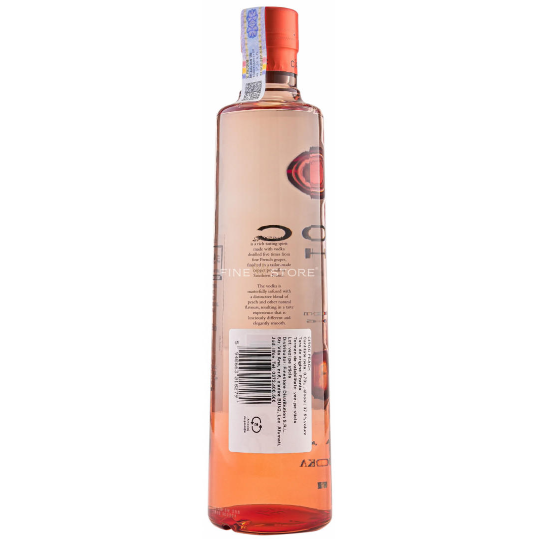Ciroc Peach este al treilea sortiment aromat care se alătură familiei Ciroc Ultra-Premium Vodka. Distilată de cinci ori pentru a beneficia de cea mai bună calitate şi cel mai intens gust, vodca este infuzată cu un amestec special de piersică şi arome naturale. Textura catifelată se datorează procedeelor de fermentare şi macerare la rece. Creată doar din soiuri de struguri franţuzeşti de calitate superioară, Ciroc Peach este absolut delicioasă atunci când este savurată cu un strop de şampanie.