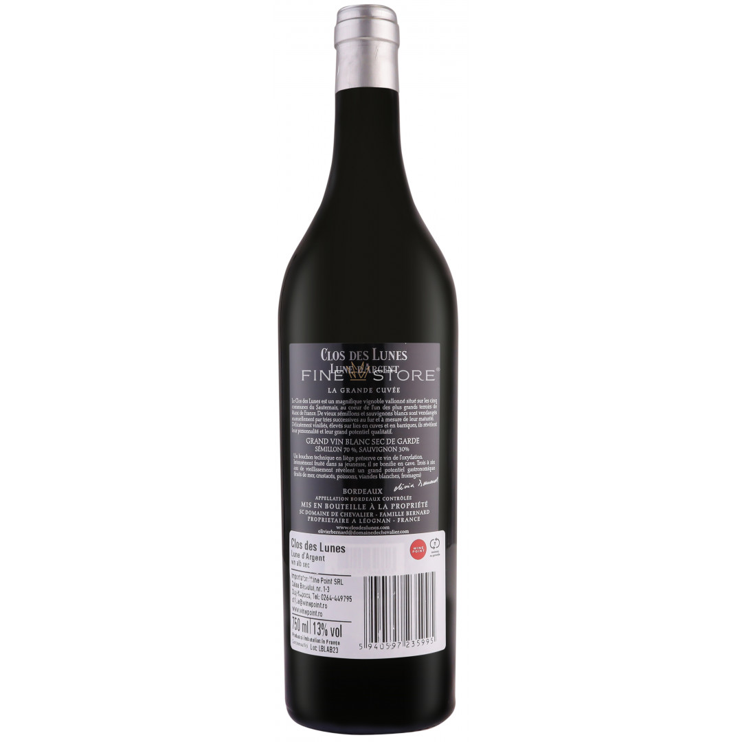 Visul lui Olivier Bernard, proprietarul Clos Des Lunes, este acela de a crea unele dintre cele mai bune vinuri seci din Sauternes. Lune d’Argent este un astfel de vin maiestuos, rezultat al unei selecții riguroase de struguri Sémillon şi Sauvignon Blanc din vițe vechi de 35 ani. Pentru Lune d’Argent, strugurii au fost recoltaţi manual dimineața, pentru a-i păstra proaspeţi şi potenţi aromatic, fiecare lot fiind cules la maturitatea maximă. Vinul petrece 6 luni pe drojdii, cu batonaj regulat, 25% din cantitate fiind maturată în butoi și 75% în cisterne mici, la temperatură controlată. Clos Des Lunes Lune D'Argent este un vin corpolent, dar prietenos şi vioi, care se simte cel mai bine în pahar la o temperatură de 10 grade Celsius. Asocierile culinare pe care acest vin le acceptă sunt variate, de la fructe de mare şi crustacee, la foie gras, fripturi picante sau sushi şi până la brânzeturi moi sau mature.