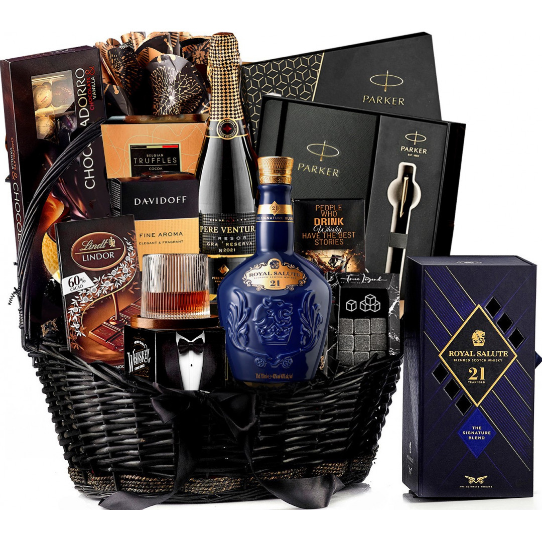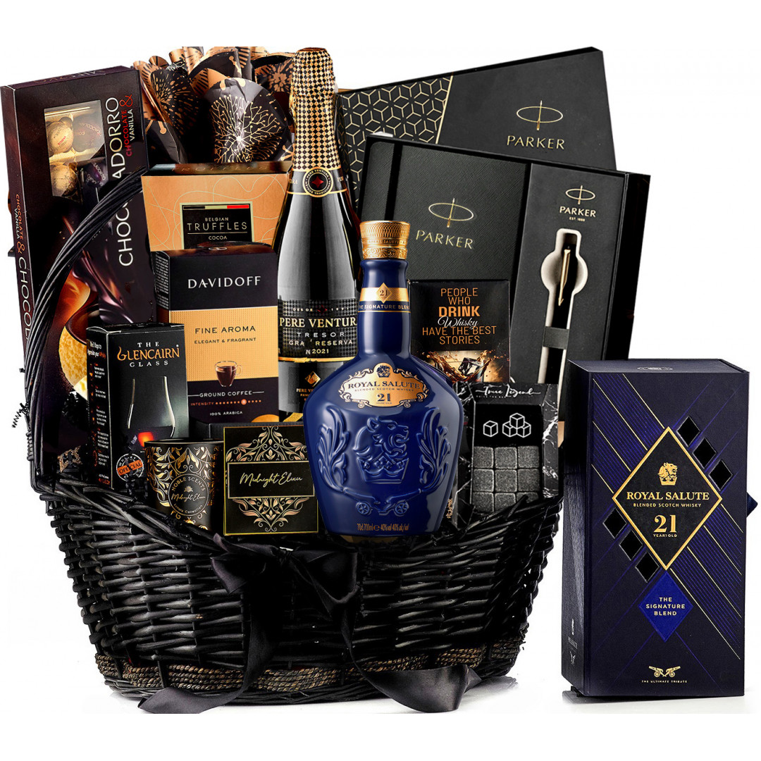 Dacă atuul său este eleganţa, atunci dăruieşte-i rafinament cât cuprinde cu un coş cadou preţios, inspirat de nobleţea bijuteriilor regale. Coşul Cadou Royal Crown dezvăluie în primul rând savoarea absolută a unui Blended Scotch Whisky clasic, creat pentru prima dată la încoronarea Reginei Elisabeta a II-a şi îmbuteliat într-un decantor din porţelan, care surprinde cu un gust ce exprimă o combinaţie de malţuri rare, învechite cel puţin 21 de ani. Iar dacă încă nu te-ai convins de valoarea regală a acestui cadou, îţi vom face cunoştinţă şi cu un spumant imperial, cu un pahar special creat pentru a degusta whisky precum un adevărat connoisseur, cu instrumente de scris de lux, un difuzor aromatic premium pentru cameră sau cea mai aromată lumânare parfumată creată vreodată. Și cum altfel puteam să încheiem această incursiune printre gusturi, arome şi accesorii sofisticate, decât cu un ambalaj strălucitor, care te face curios să descoperi şi celelalte delicii aflate în interior?