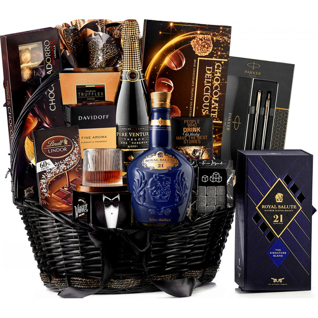 Dacă atuul său este eleganţa, atunci dăruieşte-i rafinament cât cuprinde cu un coş cadou preţios, inspirat de nobleţea bijuteriilor regale. Coşul Cadou Royal Crown dezvăluie în primul rând savoarea absolută a unui Blended Scotch Whisky clasic, creat pentru prima dată la încoronarea Reginei Elisabeta a II-a şi îmbuteliat într-un decantor din porţelan, care surprinde cu un gust ce exprimă o combinaţie de malţuri rare, învechite cel puţin 21 de ani. Iar dacă încă nu te-ai convins de valoarea regală a acestui cadou, îţi vom face cunoştinţă şi cu un spumant imperial, cu un pahar special creat pentru a degusta whisky precum un adevărat connoisseur, cu instrumente de scris de lux, un difuzor aromatic premium pentru cameră sau cea mai aromată lumânare parfumată creată vreodată. Și cum altfel puteam să încheiem această incursiune printre gusturi, arome şi accesorii sofisticate, decât cu un ambalaj strălucitor, care te face curios să descoperi şi celelalte delicii aflate în interior?
