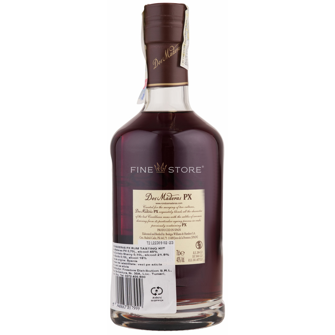 Bodegas Williams & Humbert deţine secretul artei distilării unora dintre cele mai savuroase băuturi tari, trei dintre ele fiind incluse în acest Kit de Degustare creat ca o călătorie aromatică printre gusturi intense. Dos Maderas 5 + 5 Pedro Ximenez este piesa centrală a acestui set şi totodată acel blend complex, cu origini caraibiene, care-şi şlefuieşte aromatica perfectă abia după ce trece prin trei stagii de maturare. După o învechire de 5 ani în climatul fierbinte din Insulele Caraibe şi o maturare de 3 ani la Bodegas Williams & Humbert, blendul parcurge ultimul şi cel de-al treilea prag de maturare în butoaie speciale unde s-a păstrat anterior sherry timp de 20 de ani. Astfel, degustarea sa dezvăluie arome intense de vanilie, stafide şi smochine dulci, care se topesc într-un finish lung şi aromat, splendid în degustări seci sau cu gheaţă, dintr-un pahar tip balon.