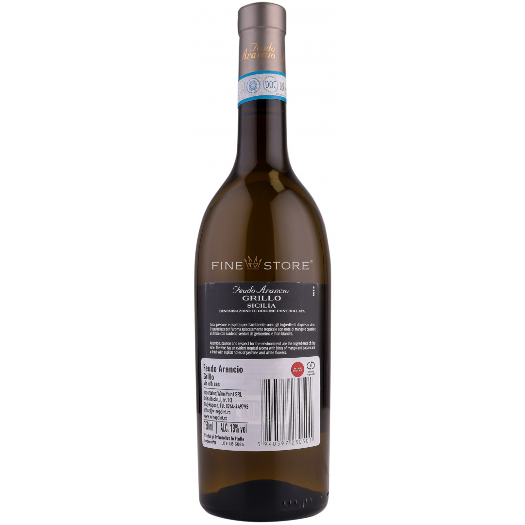 Feudo Arancio Grillo este o licoare realizată din soiul de struguri Grillo, cel mai popular soi alb al Siciliei, folosit încă din antichitate. Pentru Feudo Arancio Grillo, strugurii sunt culeși în luna septembrie, atunci când ating maturitatea optimă sub soarele generos sicilian şi vinificați prin metoda reducției, ca ulterior licoarea să se contureze timp de 5 luni prin maturare în butoaie de oțel. Rezultatul? Excelent. Un vin armonios, cu note florale și fructate, care cere a fi savurat la o temperatură cuprinsă între 10 și 12 grade Celsius. Feudo Arancio Grillo este perfect alături de fructe de mare, paste cu legume, carne albă sau pește, dar este şi partenerul ideal al gustărilor mai rafinate, cum ar fi carpaccio de vițel cu țelină și căpșune.