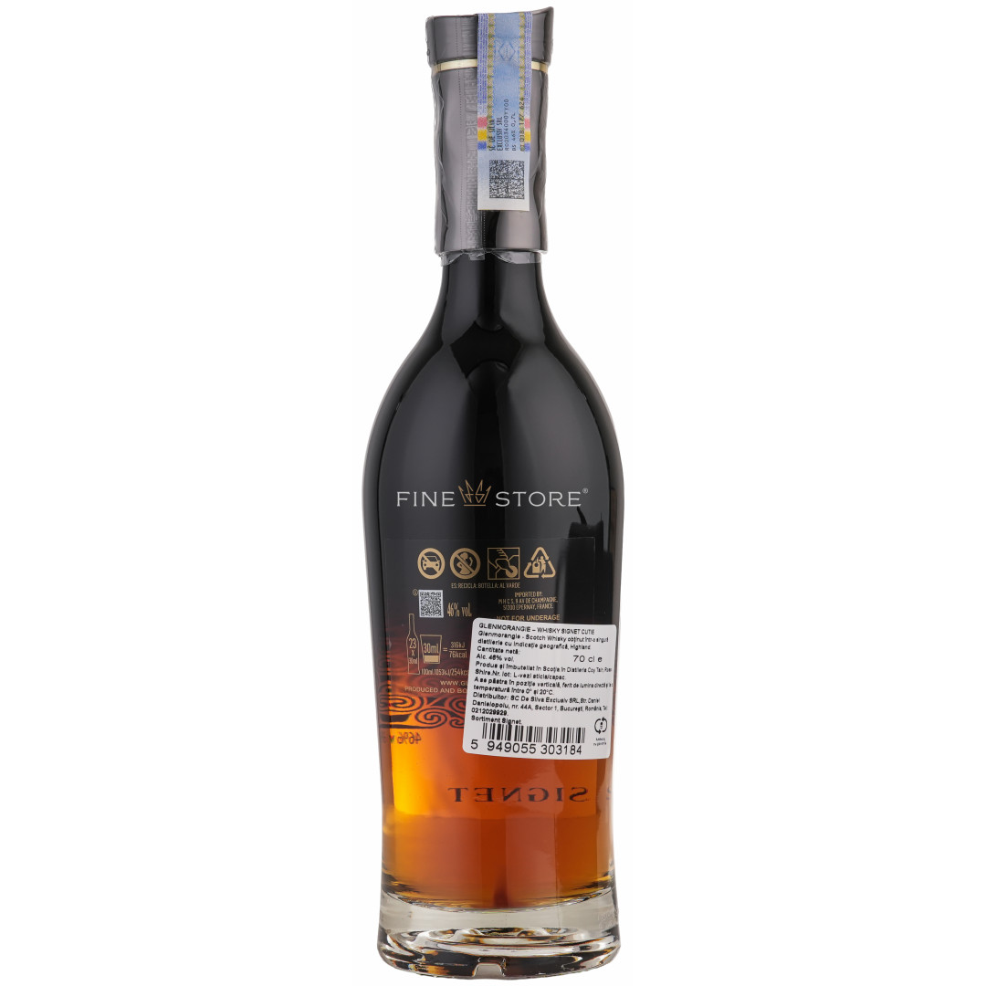 Glenmorangie Signet este o fuziune de elemente rare, îmbinate în secret pentru a culmina într-un produs extraordinar, capabil să ofere o experienţă gustativă unică. Sortimentul este distilat acum 30 de ani şi este maturat într-o selecţie de butoaie dintre cele mai alese pentru a contura caracterul celui mai aromat whisky din gamă. Deşi procesul de producţie este păstrat secret, aflăm totuşi că şarmul sortimentului se datorează în mare parte malţului din orz prăjit cu aromă de ciocolată şi a butoaielor realizate special pentru Glenmorangie din lemn de stejar alb american. Single malt-ul Glenmorangie Signet nu este doar cel mai intens sortiment al gamei, ci probabil cel mai intens whisky dintre toate sortimentele din zona Highland.