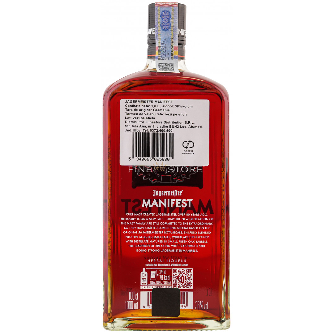 Este cunoscut faptul că brandul Jagermeister este unul nonconformist şi că fiecare licoare a sa reflectă acest spirit. Dar cel mai mult putem observa spiritul acesta rebel în Jagermeister Manifest, o expresie cu totul aparte, pentru care s-au rescris reguli și s-au căutat ingrediente inovatoare, dar cel mai mult s-a investit creativitate și experiență. Rezultatul este un lichior inconfundabil, cel mai rebel dintre rebeli, ce aduce în aroma sa premium note de fructe uscate și anason, tonuri amărui și vanilie împletită cu esențe lemnoase. Jagermeister Manifest este un lichior care aduce împreună 56 de plante şi se laudă cu un aspect ce iese din tiparele brandului: o licoare de culoarea chihlimbarului într-o sticlă îndrăzneață și robustă. Jagermeister Manifest se servește ușor răcit în pahare de shot.