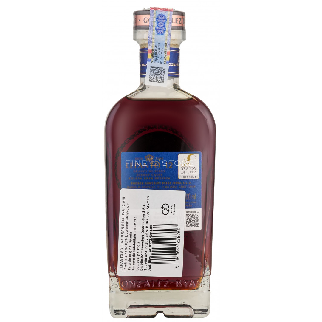 Lepanto Solera Gran Reserva 12 ani este un brandy de Jerez multipremiat pentru calităţile aromatice inedite, evidente indiferent că alegeţi să-l savuraţi sec, asociat cu blue cheese sau integrat într-un cocktail. Brandy-ul produs de González Byass exclusiv în Jerez este obţinut prin distilarea unor vinuri selecţionate din struguri Palomino copți în podgoriile proprii şi o învechire de 9 ani în system Solera, folosind butoaie de stejar american umplute anterior cu sherry Tio Pepe, urmată de o maturare suplimentară de 3 ani în butoaie umplute anterior cu sherry Matusalem Oloroso. Din vie şi până în pahar, fiecare etapă de producţie şlefuieşte lent şi cu migală identitatea acestei băuturi pur savuroase, astfel că la final, gustul etalat de Lepanto Solera Gran Reserva 12 ani oferă o experienţă a degustării cu totul aparte.