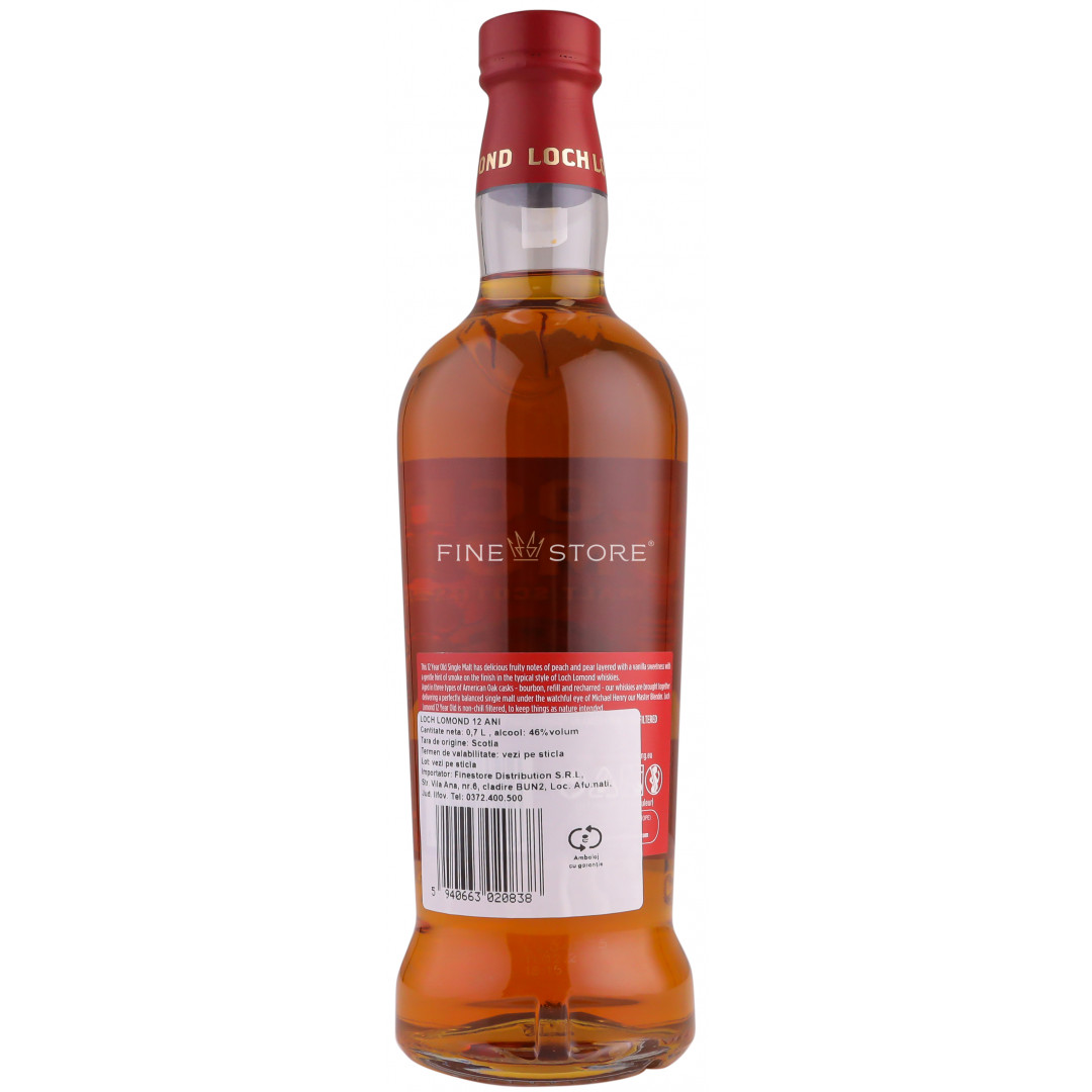 Loch Lomond 12 Ani aduce parfum de livadă şi relaxare în pahar, cu fiecare degustare. Splendidul whisky scoţian dezvăluie un caracter intens fructat, unde piersicile şi perele oferă un adevărat recital al aromelor, scăldate fiind în dulceaţa vaniliei, sub mângâierea fină a notelor de fum. Avem de-a face cu o adevărată poezie a aromelor, care n-ar fi putut fi scrisă decât printr-o maturare în trei tipuri de lemn: butoaie de bourbon, butoaie reumplute şi butoaie arse pentru a doua oară în interior. Michael Henry, Master Distiller Loch Lomond, are grijă ca în urma acestei triple maturări să se obţină echilibrul aromatic perfect şi caracterul savuros dorit, iar Loch Lomond 12 Ani este dovada vie că procesul, deşi complex, funcţionează perfect. Savurează acest single malt sec şi bucură-ţi simţurile cu generozitatea aromelor fructate pe care acesta le etalează fără reţineri în pahar.