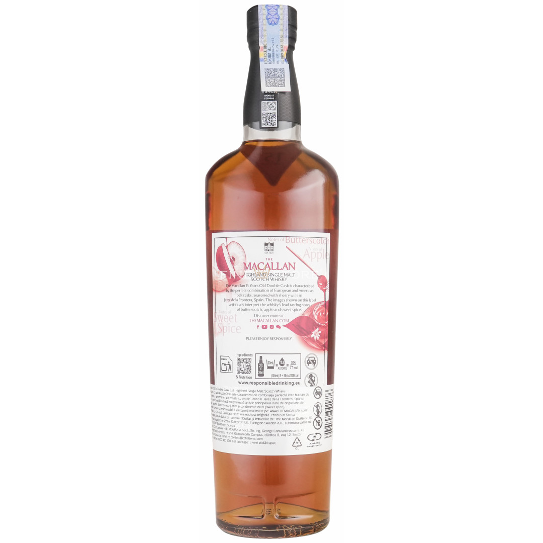 Seria Double Cask explorează felul în care două tipuri diferite de stejar creează idealul aromatic pentru whisky-uri, în cazul expresiei Macallan de 15 ani fiind vorba despre o maturare în butoaie de stejar american lucrate manual şi asezonate cu Sherry şi o maturare în stejar european. Dacă maturarea în stejar european aduce cu ea condimentele specifice Macallan, cealaltă maturare adaugă nuanţe de citrice, vanilie şi butterscotch acestui whisky, toate aceste calităţi împletindu-se la perfecţiune într-o degustare seacă sau cu o bilă de gheaţă, unde single malt-ul dezvăluie un profil aromatic dulceag şi prietenos, dar sofisticat şi complex totodată.