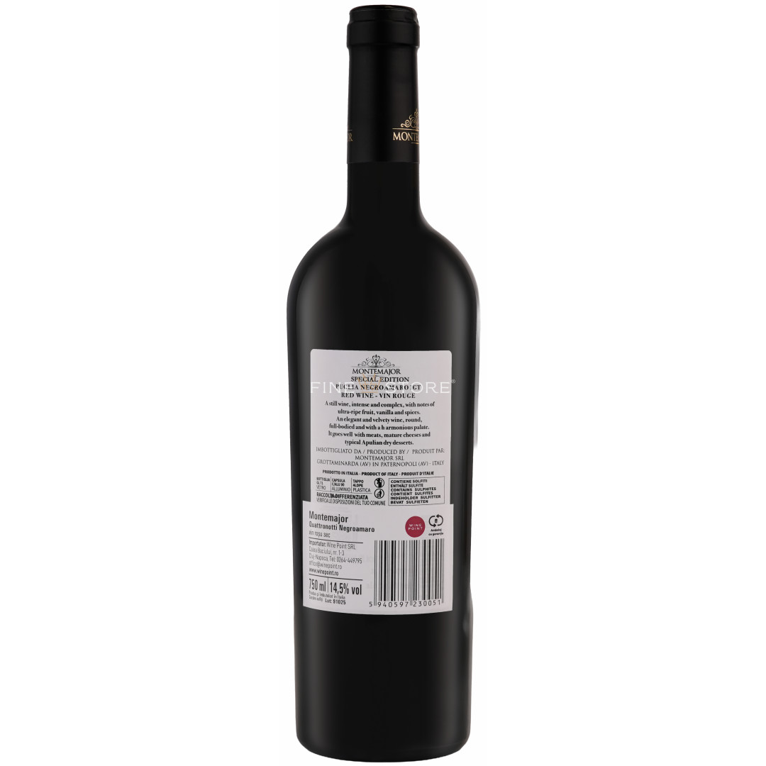 Fabulosul Montemajor Quattronotti este creat din struguri culeşi manual după lăsarea întunericului, pentru a evita expunerea suplimentară la soare a boabelor coapte la perfecţiune. Denumirea vinului vine, aşadar, de la cele patru nopţi în care strugurii sunt recoltaţi din viile ce-şi întind rădăcinile adânc în solul din Puglia, acolo unde soiul Negroamaro dezvoltă calităţi aromatice extraordinare. Avem de-a face deci cu un vin roşu extrem de armonios, în ciuda complexităţii sale, care în plus etalează rotunjime, gust intens fructat şi o textură catifelată, care alintă simţurile.