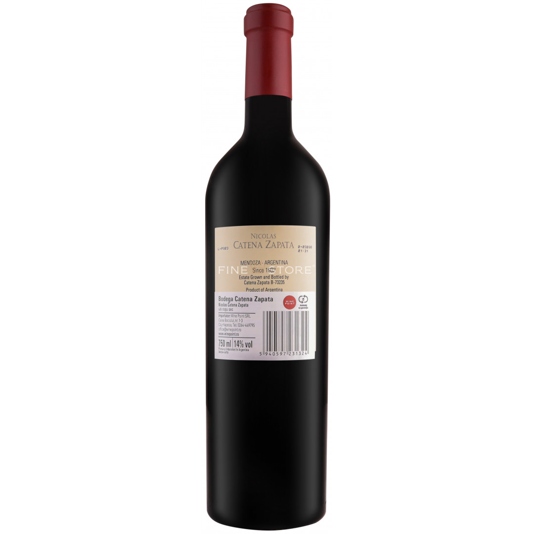 Impunător, nuanţat şi complex, Nicolás Catena Zapata este fără doar şi poate un vin argentinian de top a cărui aromatică reflectă foarte bine terroir-ul din Gualtallary (Tupungato, Uco Valley, Mendoza). Vinurile cramei merg pe principiul vinificării la temperatură controlată pentru a proteja aromele strugurilor, cu folosirea baricurilor din stejar franțuzesc pentru maturare, iar pentru această expresie de un roşu rubiniu splendid, strugurii Cabernet Sauvignon, Malbec şi Cabernet Franc au fermentat cinsprezece zile în butoaie franțuzești de 500l, tancuri de ciment și tancuri de inox, strugurii de pe anumite parcele fiind fermentaţi nedezciorchinați pentru a creşete prospeţimea vinului şi structura sa tanică. Vinul este apoi maturat 18 luni în butoaie de stejar franțuzesc, fiind îmbuteliat nelimpezit și nefiltrat pentru a dărui o experienţă a degustării splendidă, unde aromele fructate se împletesc extraordinar cu stejarul, cu aciditatea și cu atingerile minerale. Pentru a vă bucura din plin de tot ce are acest vin de oferit, Nicolás Catena Zapata se savurează la o temperatură de 17-18 grade Celsius, asociat culinar cu raţă afumată sau salate cu brânză de capră şi seminţe.