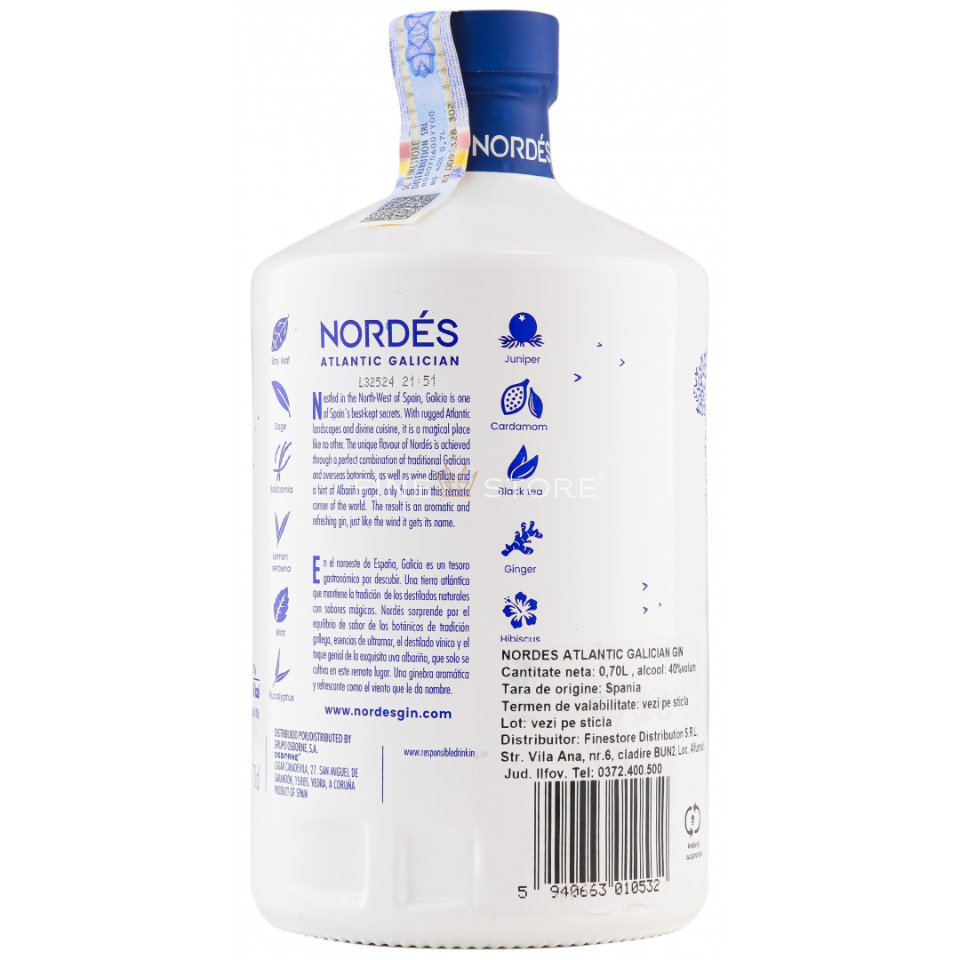 Nordes Gin se diferenţiază de alte sortimente de pe piaţă de la prima vedere, prin ambalajul inedit. Cu un buchet exploziv, predominant floral, ginul se remarcă prin faptul că unul dintre ingredientele sale de bază sunt strugurii din soiul Albariño. În plus, alte 12 plante selecţionate atent de producători îşi aduc contribuţia pentru a contura paleta aromatică deosebită a acestui gin spaniol, printre care: coji de lămâie, hibiscus, lemn dulce, eucalipt şi ghimbir. Rezultatul este un sortiment îndrăzneţ, cu un profil aromatic intrigant, proaspăt şi expresiv, potrivit pentru a fi savurat vara într-un Gin Tonic rece sau în diverse cocktailuri sofisticate.