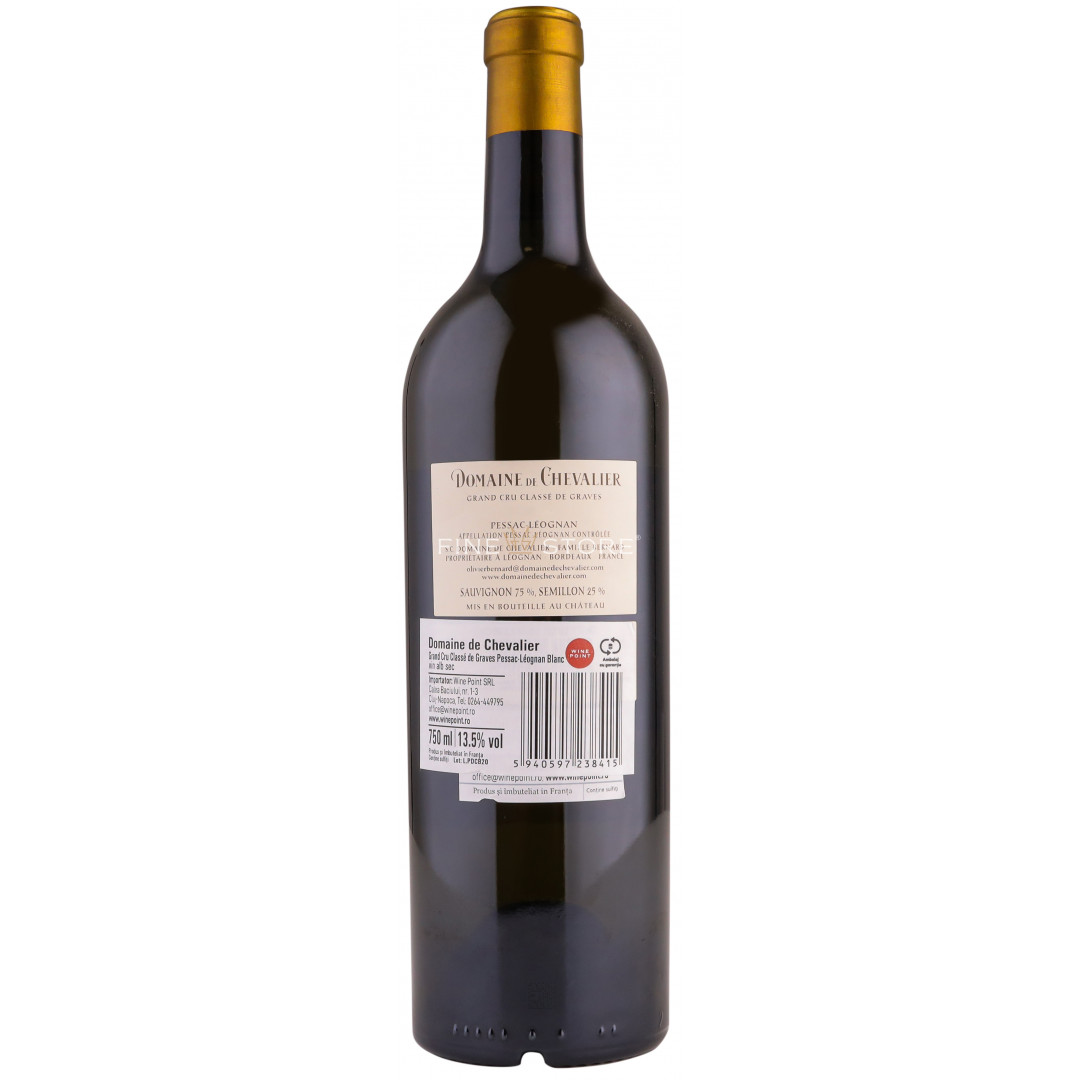 Domaine de Chevalier este creator de vinuri de Bordeaux excepţionale, faima sa fiind adusă în special de calitatea vinurilor sale albe seci, unele dintre cele mai elegante din lume. Domaine de Chevalier AOC Pessac-Léognan Grand Cru Classé de Graves Blanc aduce împreună savoarea Sauvignonului şi pe cea a soiului Semillon într-un vin extraordinar, unde strugurii sunt culeşi în mai multe etape pentru a asigura recoltarea lor în momentul optim de coacere. Fermentarea se face tradiţional în butoaie de stejar, la fel şi maturarea de 18 luni, unde 35% din butoaie sunt noi. La final, se dezvăluie un vin splendid, dinamic, cu o nuanță ce amintește de zilele calde de vară şi arome complexe ce inundă simţurile într-o manieră extrem de elegantă. Domaine de Chevalier AOC Pessac-Léognan Grand Cru Classé de Graves Blanc poate fi savurat ca aperitiv sau asociat cu paste al pesto sau carne albă pe grătar.