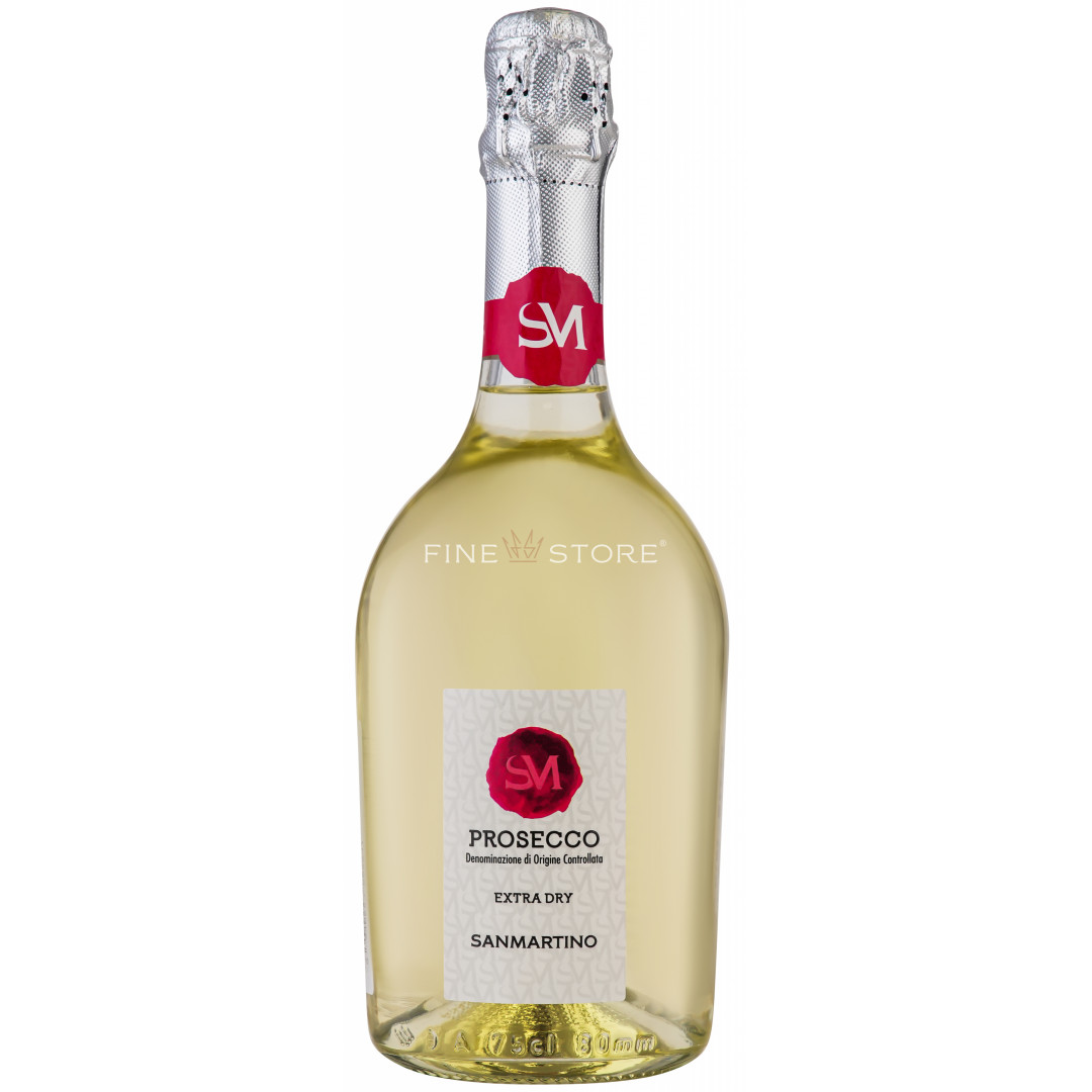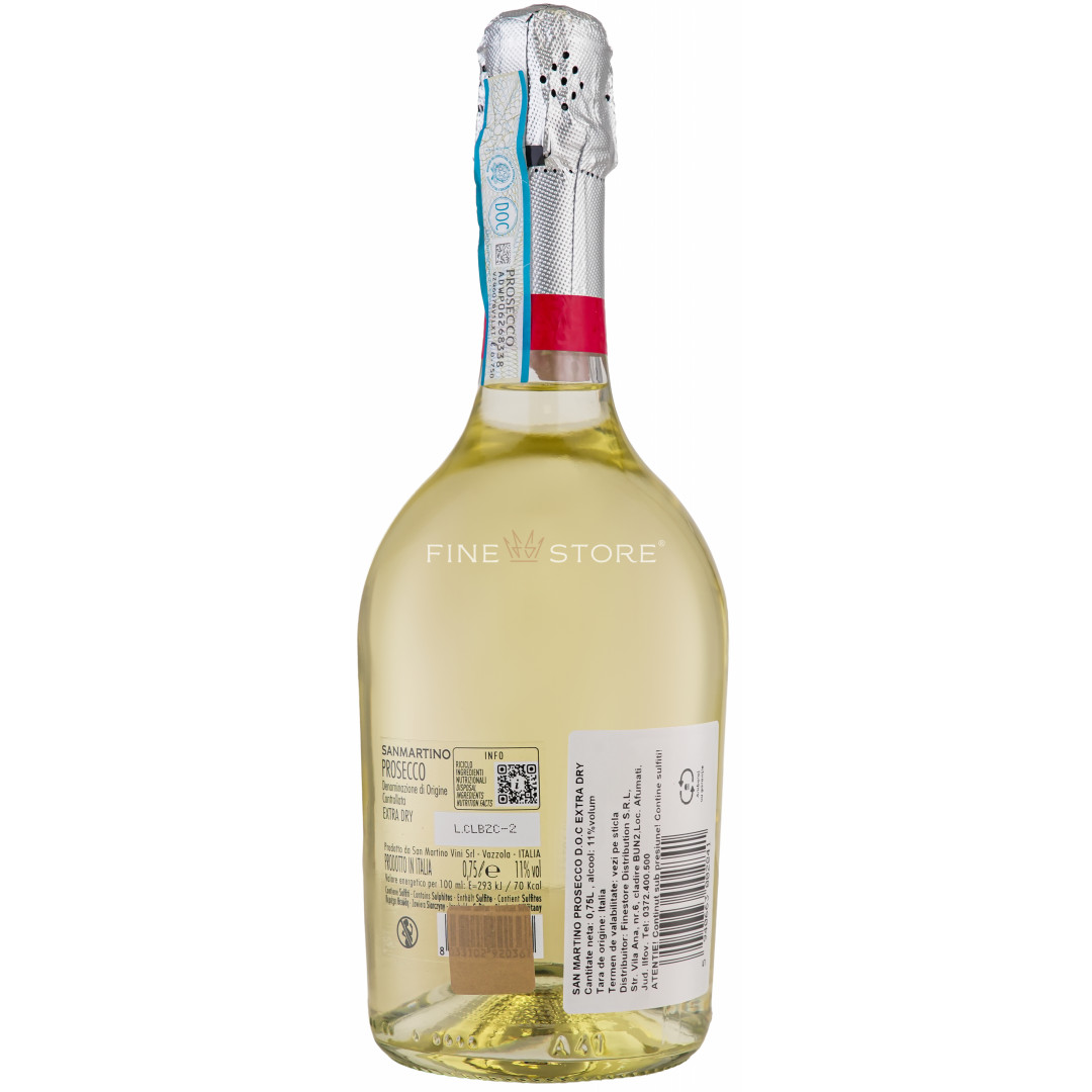San Martino Prosecco Extra Dry este creat în însorita Italie din struguri Glera atent selecţionaţi, folosind metoda Charmat cu adăugare de drojdii şi savurat peste tot în lume, ori de câte ori se ivesc momente ce fac loc micilor răsfăţuri. Vinul este descris de arome proaspete, fructate, care complimentează excelent preparate din peşte, dar care conturează de asemenea şi caracterul unui spumant-aperitiv ideal ce răcoreşte zilele caniculare de vară cât ai spune “prosecco”. Bucură-te de prospeţimea sa la o temperatură recomandată de 6- 8 grade Celsius, răcit chiar înainte de servire.